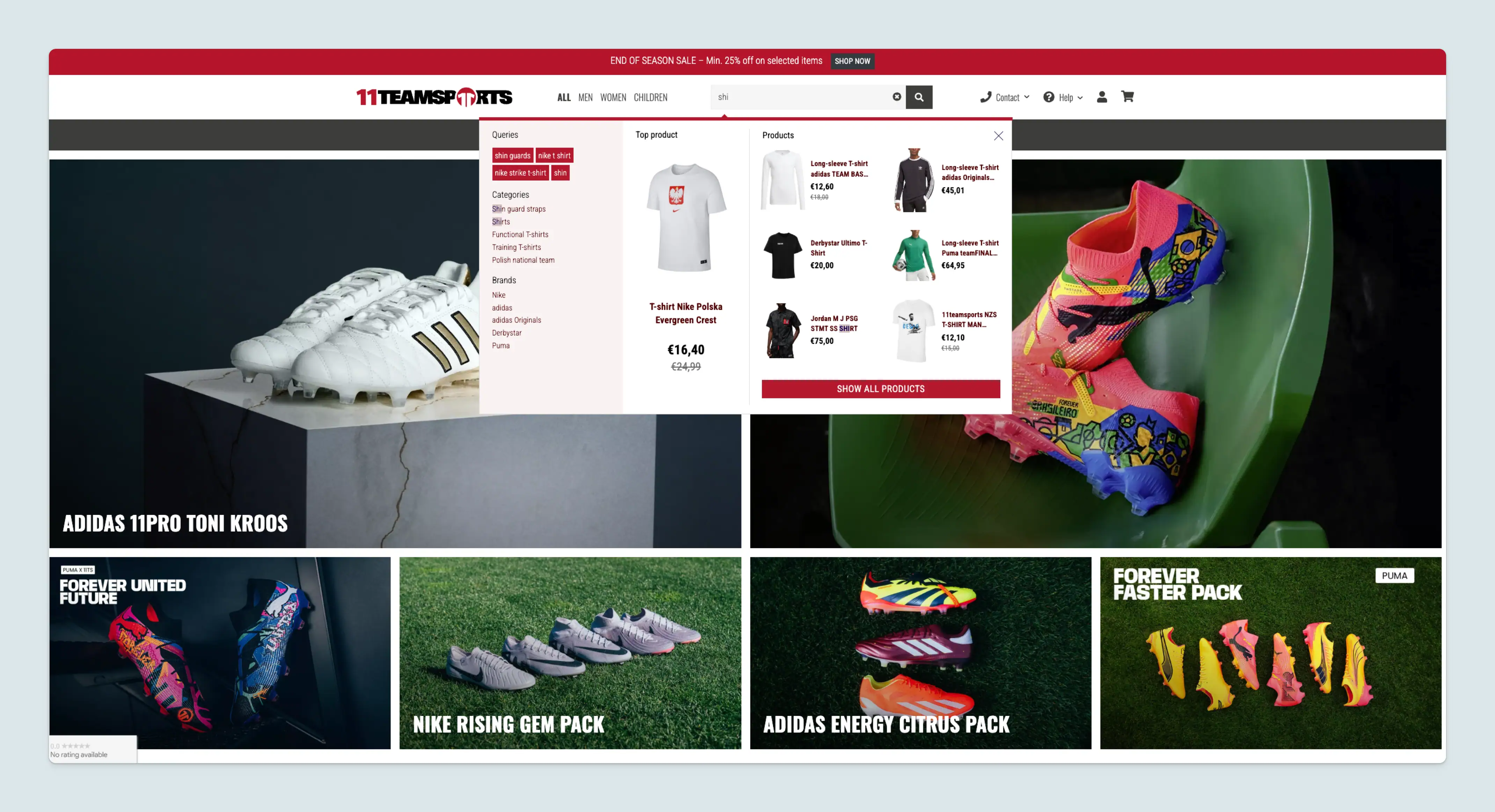 A 11teamsports estava procurando uma maneira eficaz de mostrar preços nos resultados de pesquisa. No entanto, os preços tinham de ser dinâmicos e capazes de mudar em conformidade. O Luigi’s Box resolveu isso e forneceu a 11teamsports a capacidade de mostrar preços regulares e com desconto no preenchimento automático. Além disso, os preços mudam dependendo se o cliente está logado ou não, e preços diferentes são mostrados para membros do clube.
