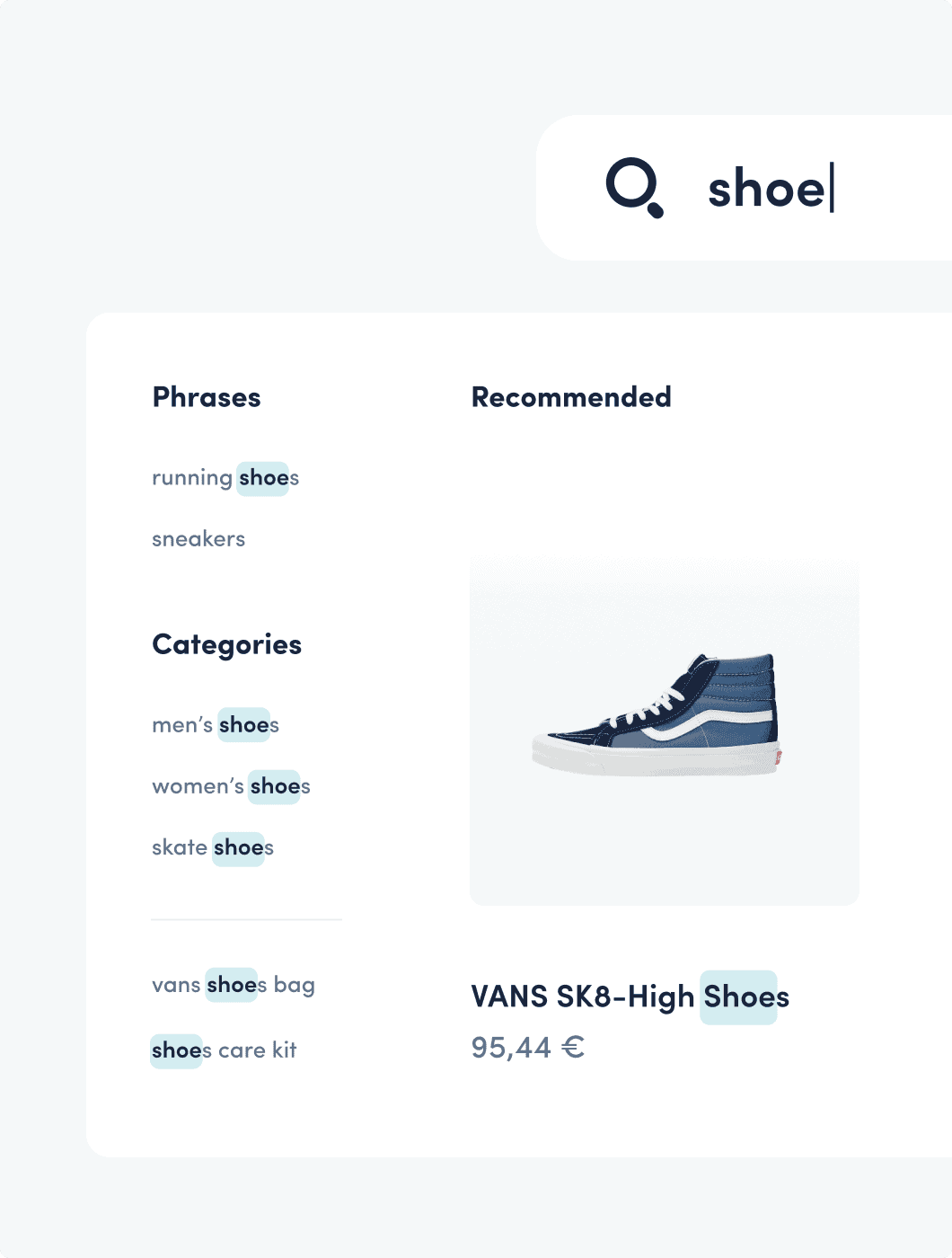 Uma caixa de pesquisa simples é ótima, mas que tal uma que possa ajudá-lo a aumentar suas vendas? Nosso recurso Searchandising pode promover produtos desejáveis para cada cliente individualmente para aumentar suas chances de realizar vendas bem-sucedidas e aumentar sua receita de maneira consistente.