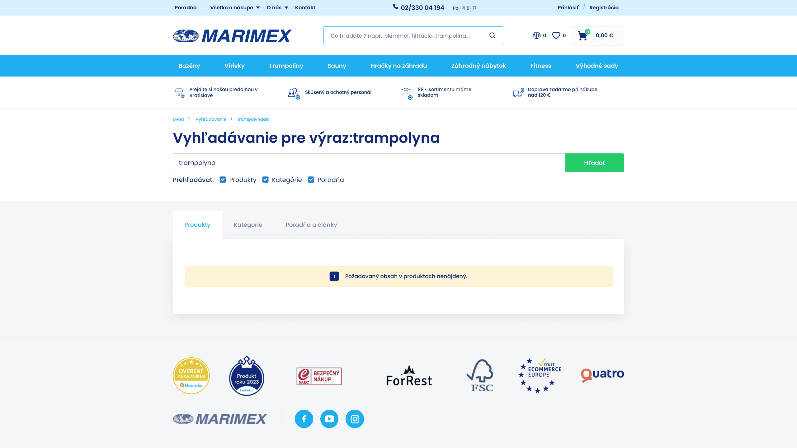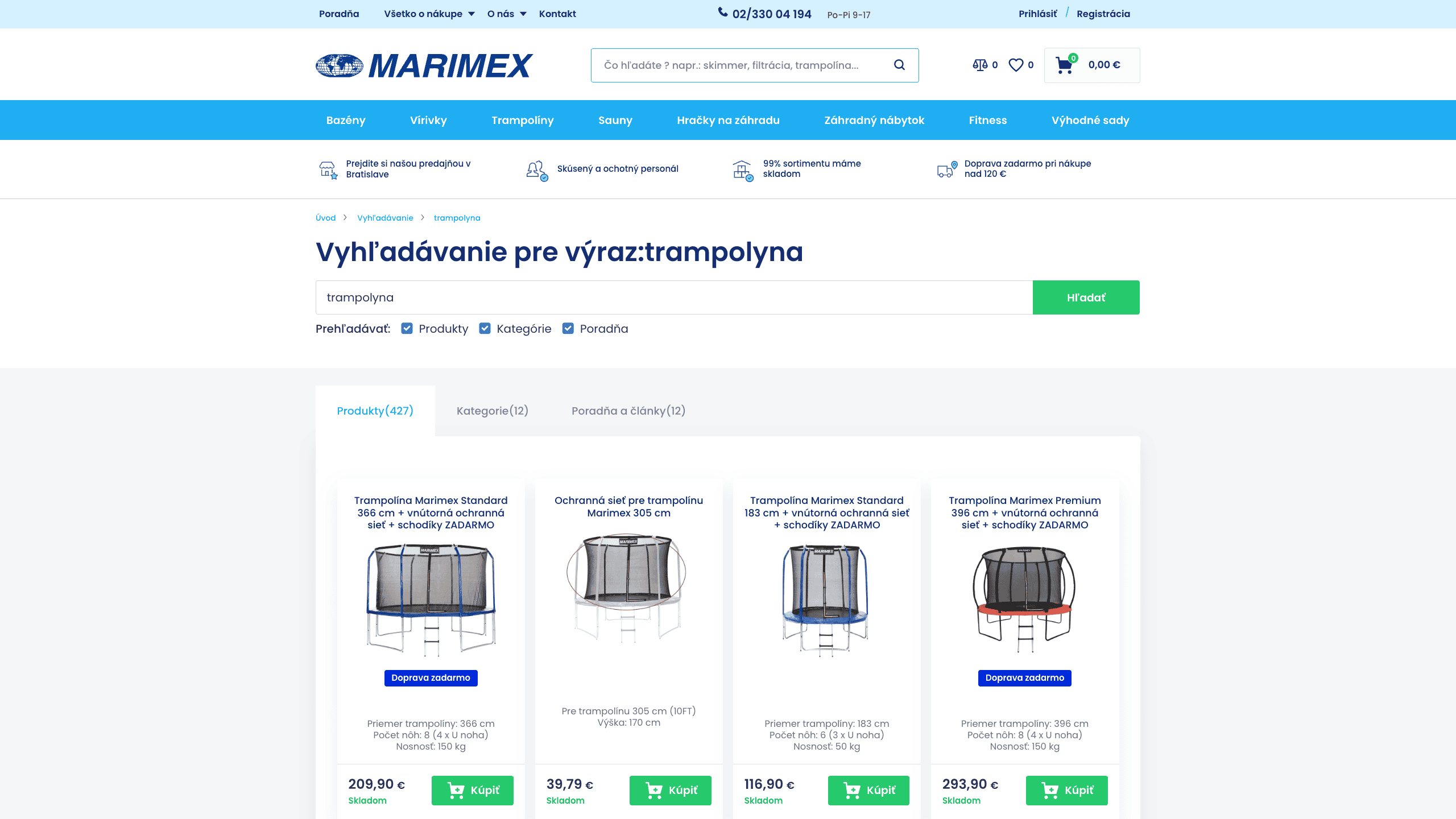 Marimex.sk is a Slovak retailer specializing in a variety of outdoor and leisure products, focusing significantly on pools, saunas, trampolines, and related accessories. They offer a wide range of above-ground pools suitable for different garden sizes, alongside a comprehensive selection of pool maintenance chemicals and equipment. Their product offerings extend to various types of saunas, including infrared saunas that are designed to fit in both houses and spacious apartments, enhancing the home wellness experience.